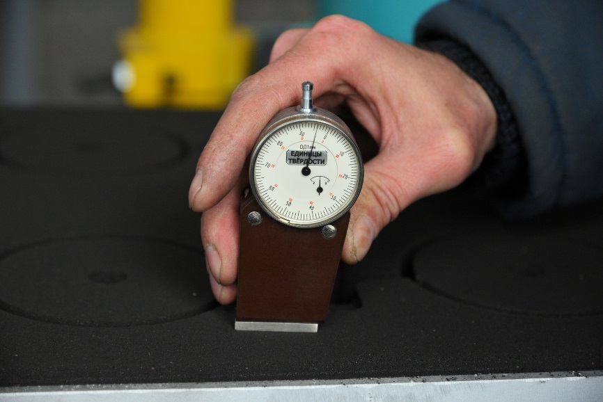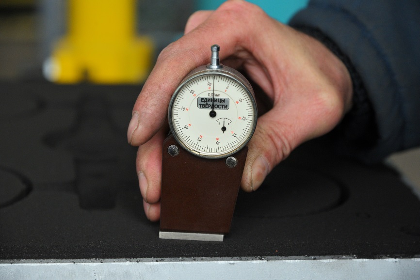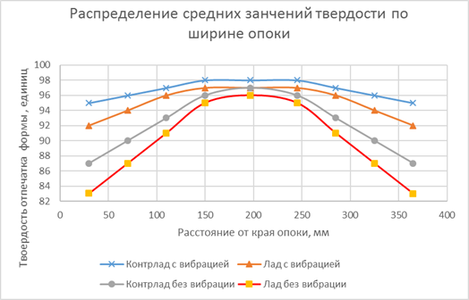 Во время отработки технологии формообразования проводились исследования на предмет влияния наличия вибрации на показатели значений твердости поверхности формы со стороны лада и контрлада опоки, определялось оптимальное усилие прессования для получения качественной формы.